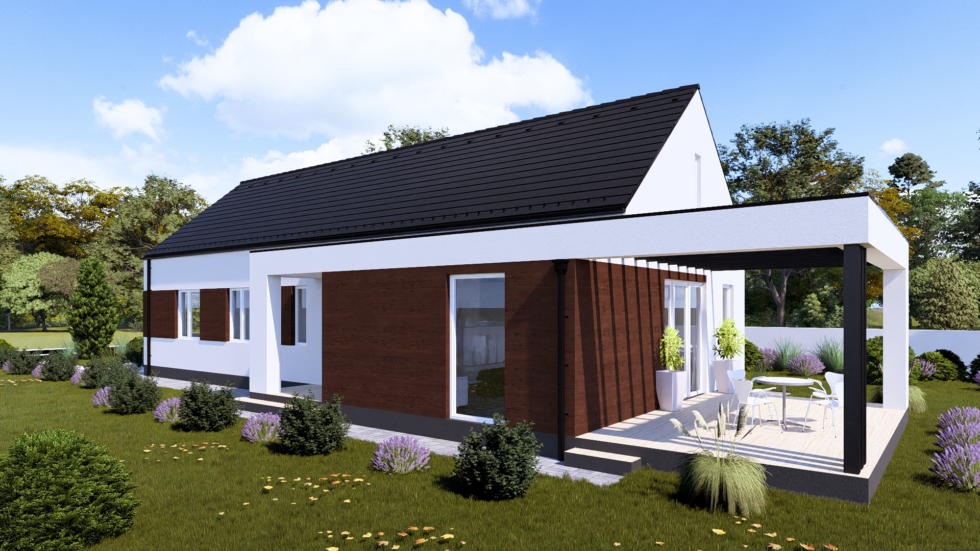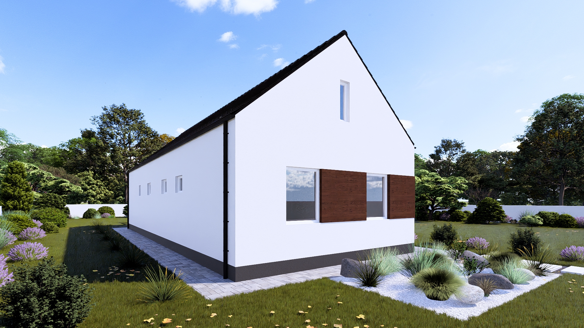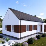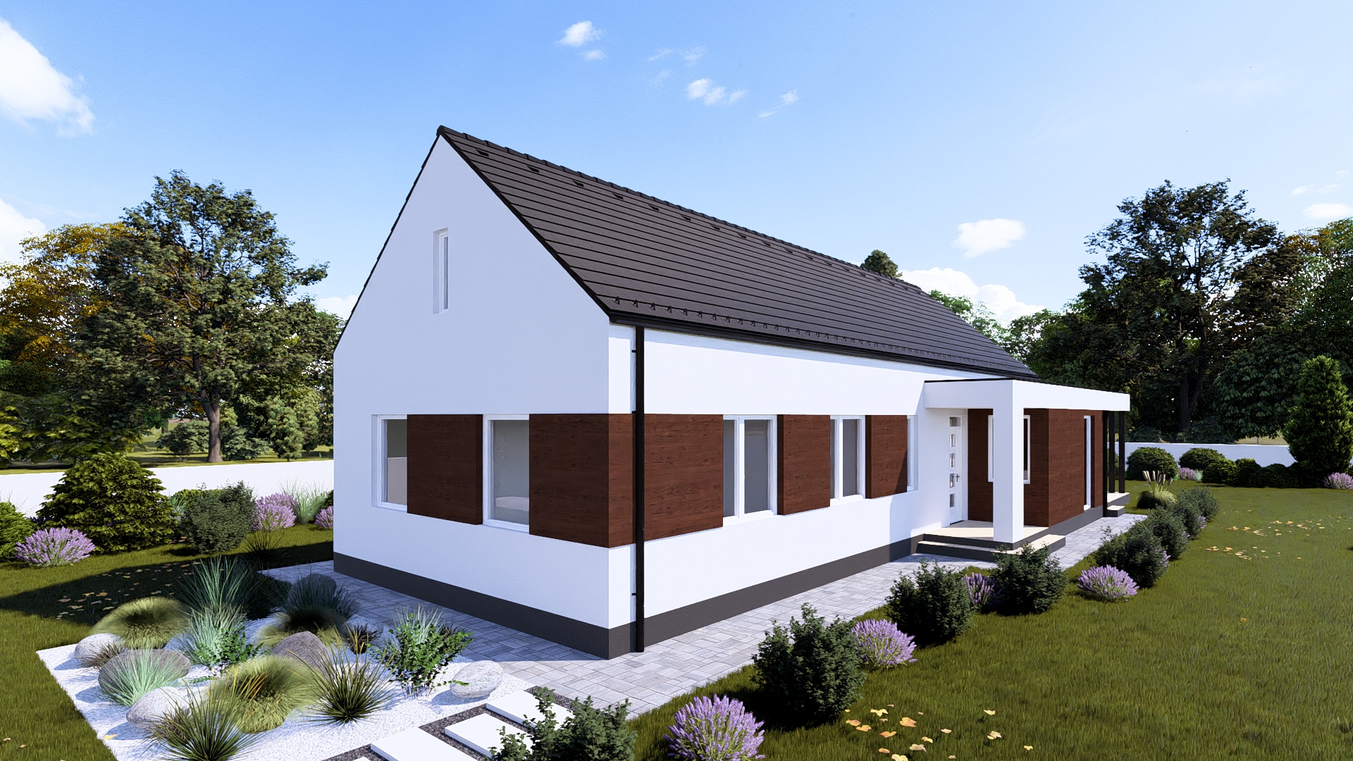 Az egyik kedvenc mintatervünk. Könnyed, modern, tekintetvonzó külső megjelenése otthonos belső teret takar, sok tárolási lehetőséggel és három különböző méretű hálószobával (szabadonálló beépítés esetén könnyen kialakítható egy 4. hálószoba is).