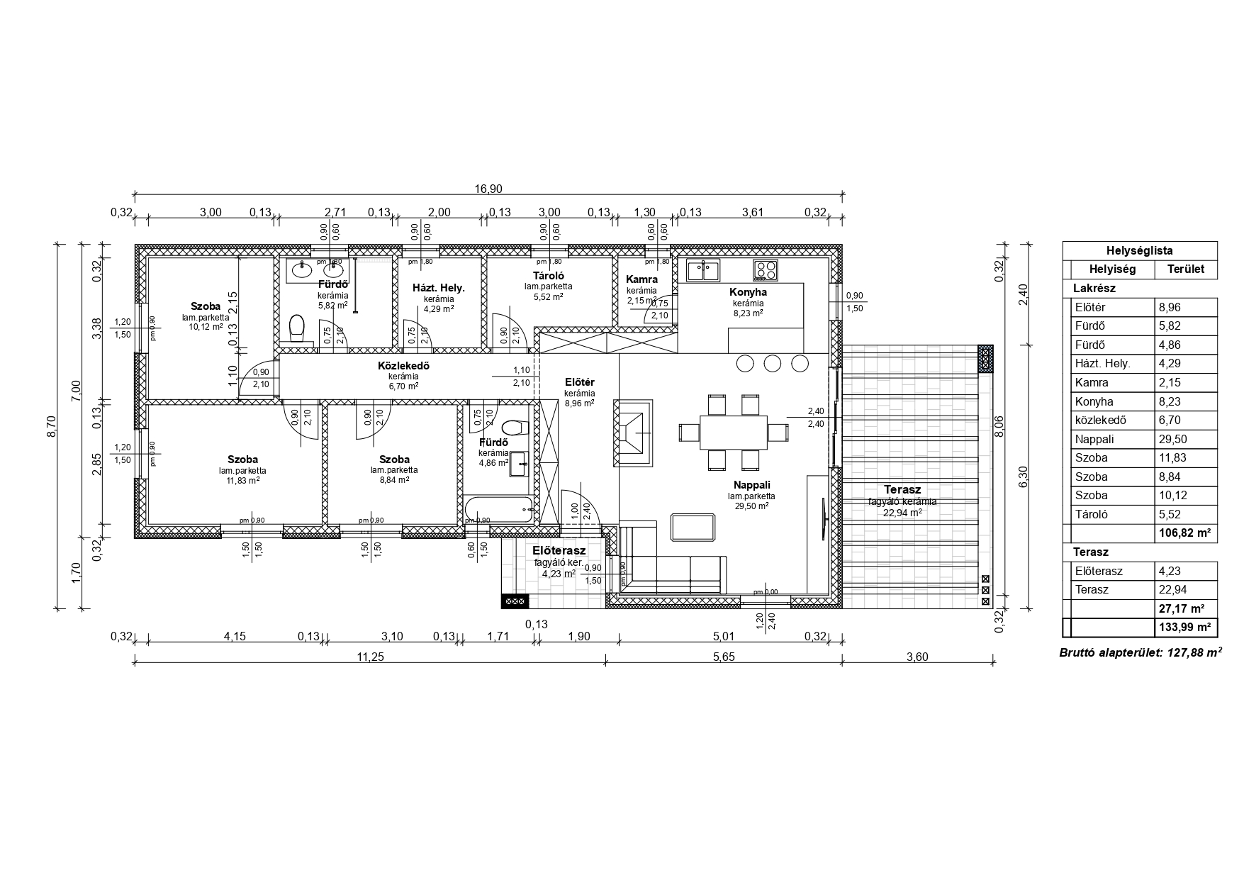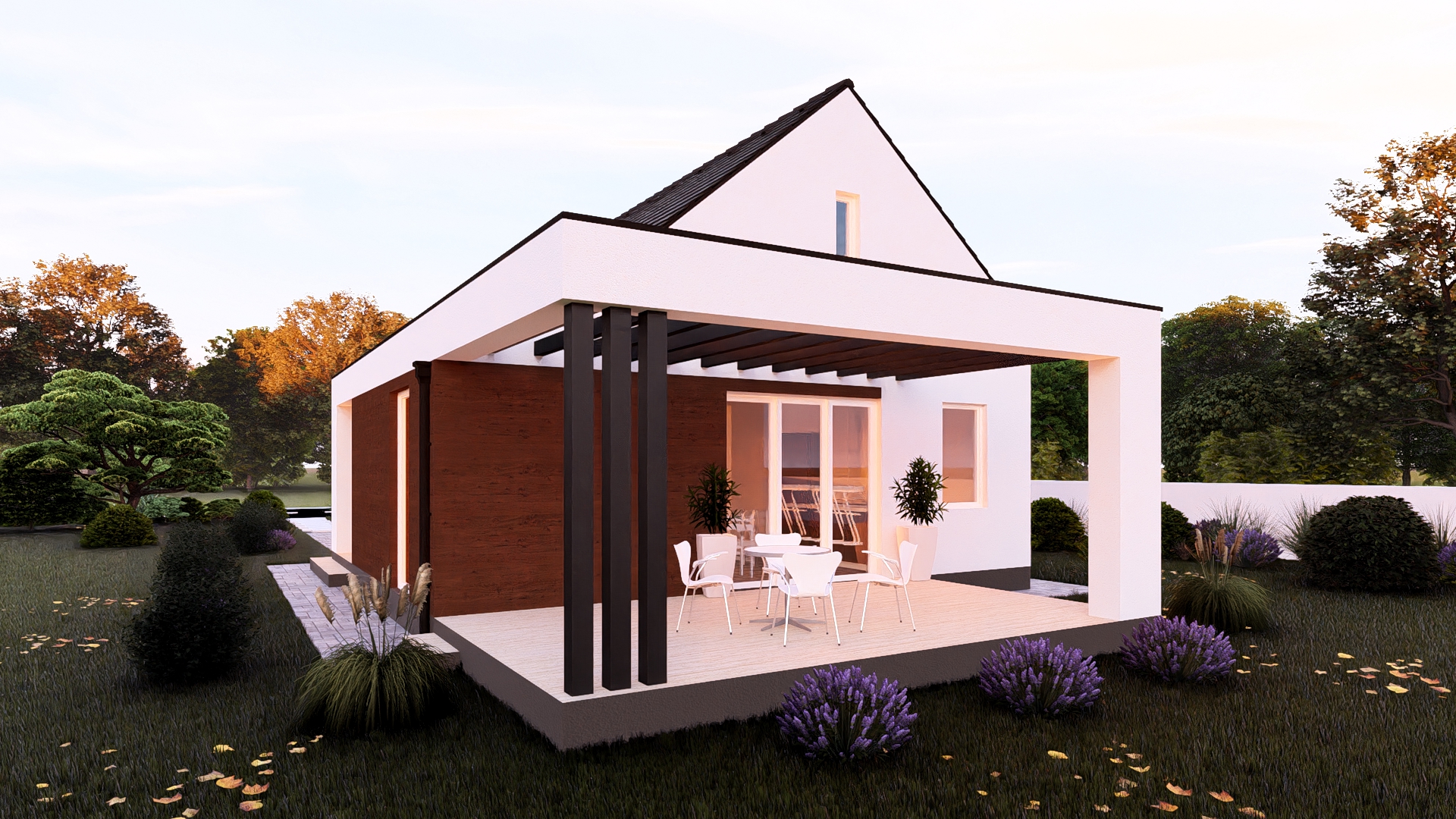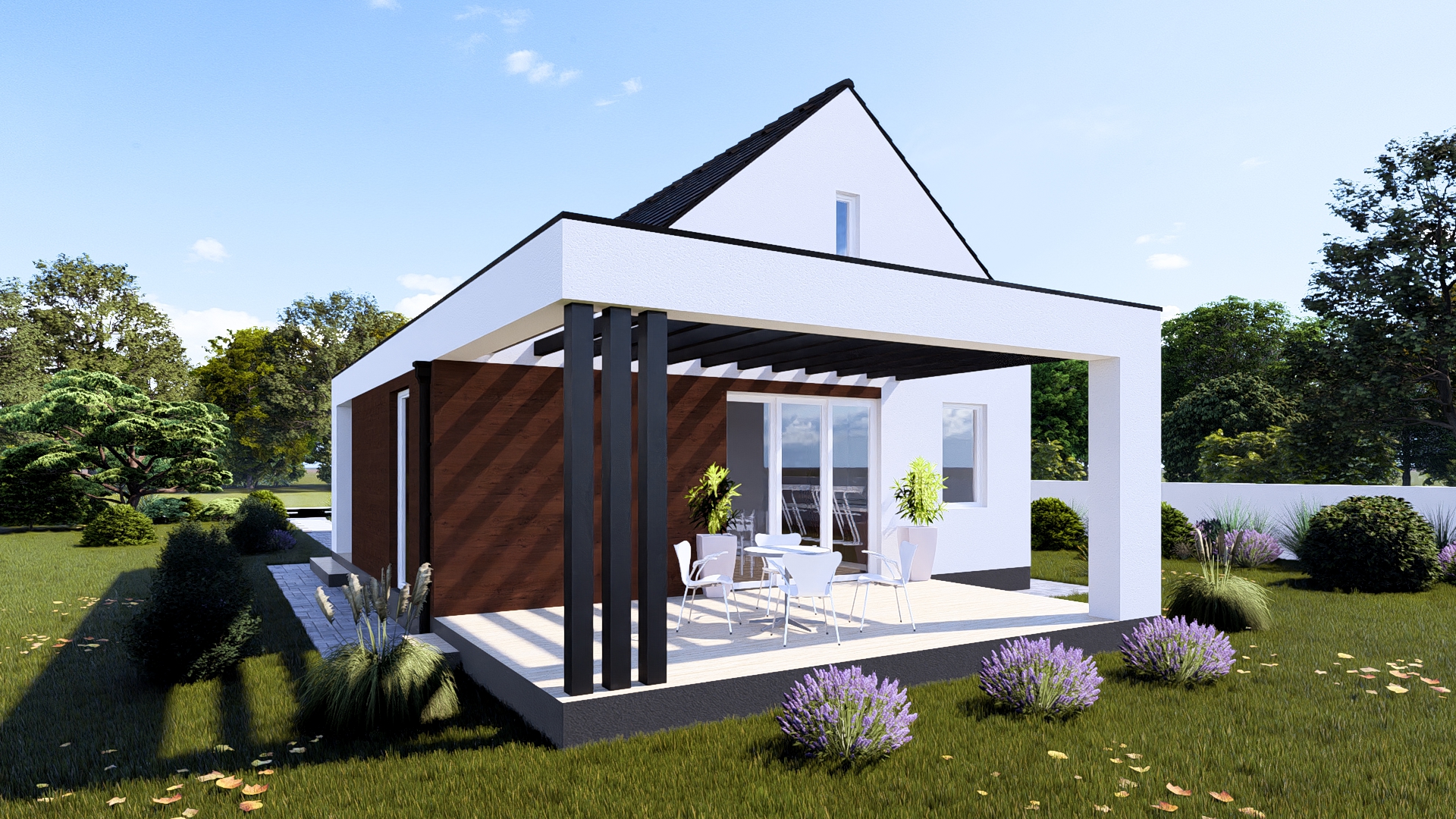 Az egyik kedvenc mintatervünk. Könnyed, modern, tekintetvonzó külső megjelenése otthonos belső teret takar, sok tárolási lehetőséggel és három különböző méretű hálószobával (szabadonálló beépítés esetén könnyen kialakítható egy 4. hálószoba is).